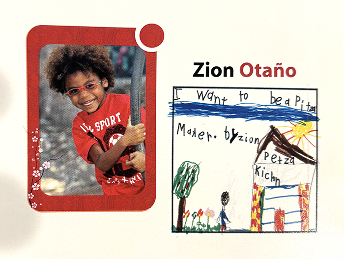 Interestingly enough, the kindergarteners at Los Encinos School are given a writing prompt for the yearbook each year to describe their dream job. Five-year-old Zion said, “I want to be a pizza maker,” and he drew a picture labelled, “pizza kitchen,” with brave spelling. He’s been a foodie all this time!