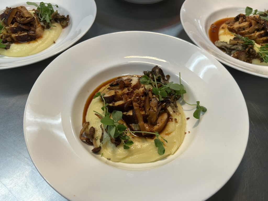(above) The dinner entree… Chicken roulade with potato puree, a chicken demi-glace, and wild roasted mushrooms.